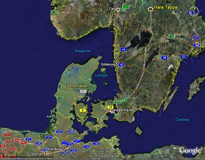 De routemogelijkheden gaan over land met bruggen, veerboten, en in combinatie. De aangegeven route Groningen - Hara is 1245km.