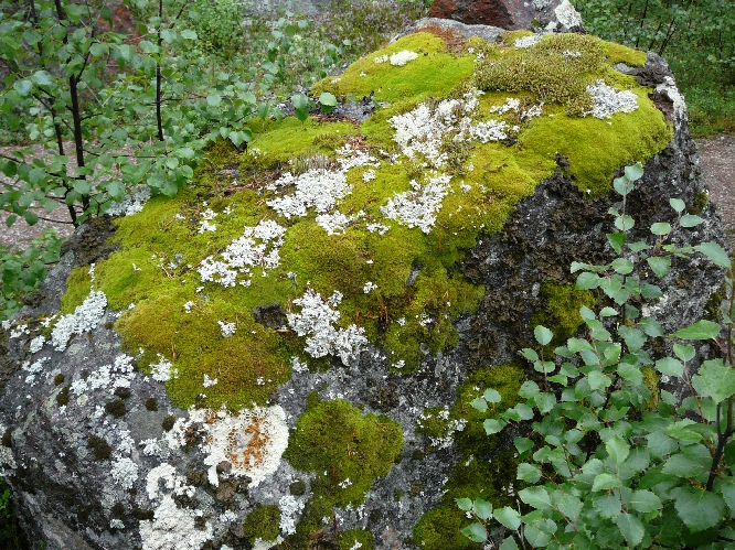 Granietblok begroeit met diverse mos soorten (bos museum Särna)