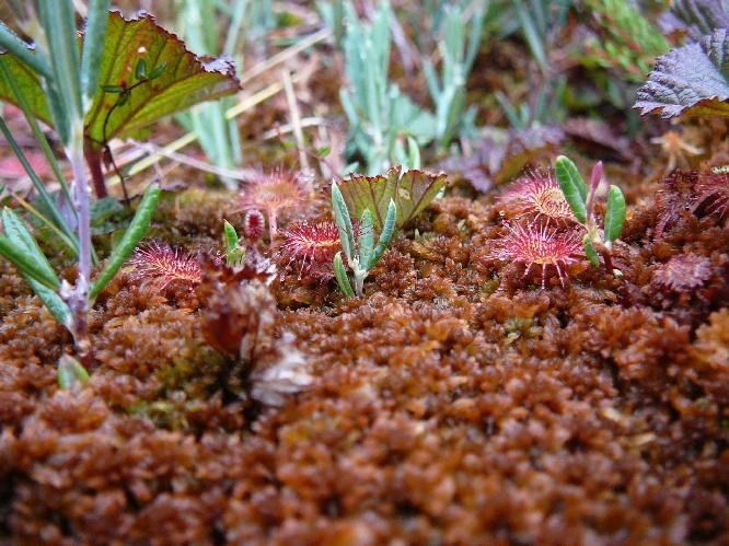 Zonnedauw, vleesetende plant die eruit ziet als anemoon (op hoogveen in bosmuseum Särna)